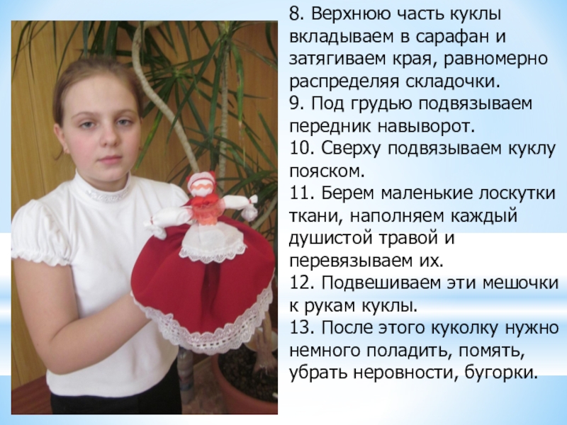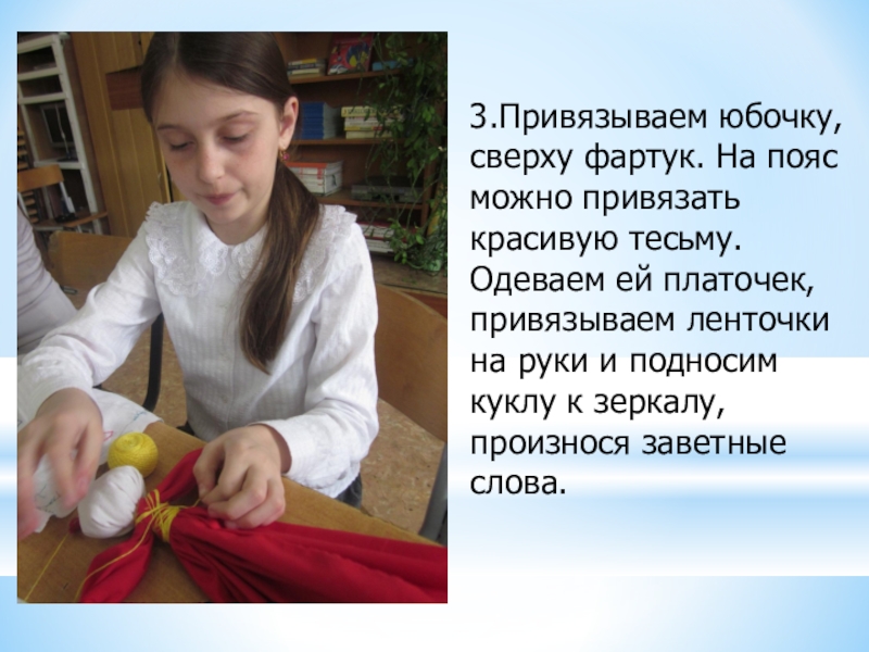 Одеваем ей платочек, привязываем ленточки на руки и подносим куклу к зеркалу, произнося заветные слова.