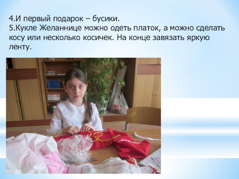 жалея её. Загадывая желания, дарят кукле подарочек в виде бусинки, пуговки, ленточки, колокольчика, серёжки.
