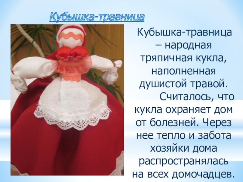 Кубышка-травница – народная тряпичная кукла, наполненная душистой травой.