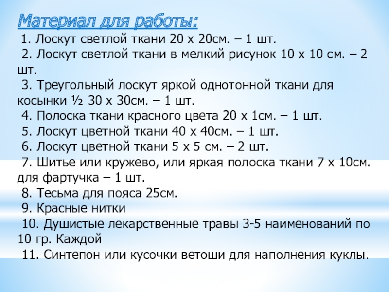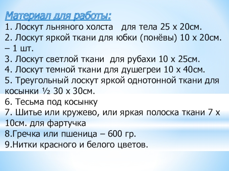 2. Лоскут яркой ткани для юбки (понёвы) 10 х 20см. – 1 шт.
