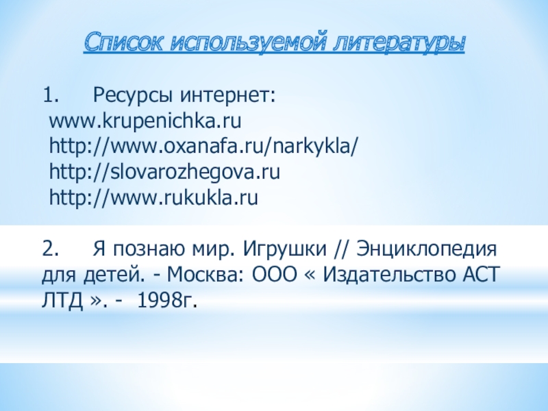Я познаю мир. Игрушки // Энциклопедия для детей. - Москва: ООО « Издательство АСТ ЛТД ». - 1998г.
