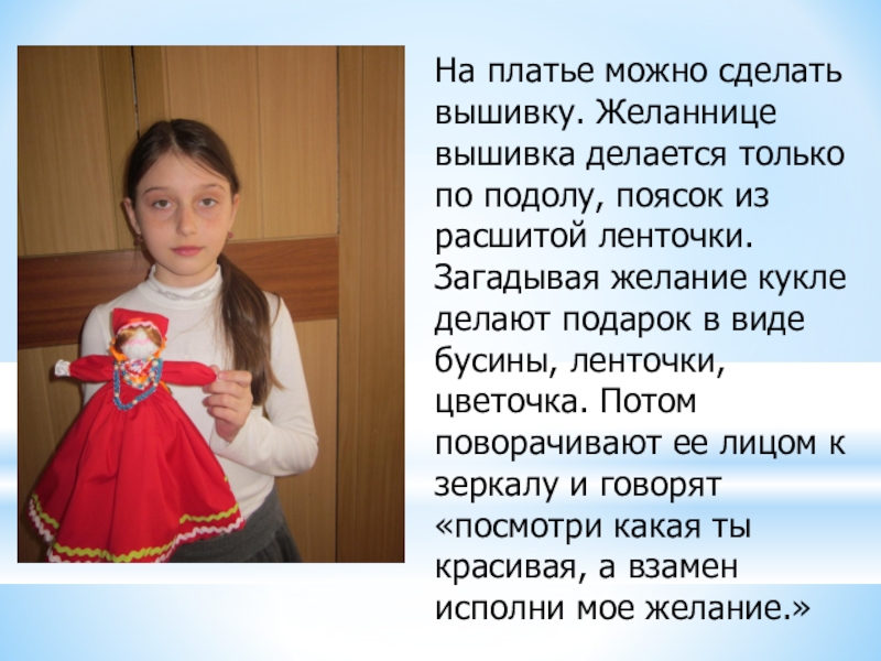 Загадывая желание кукле делают подарок в виде бусины, ленточки, цветочка. Потом поворачивают ее лицом к зеркалу и говорят «посмотри какая ты красивая, а взамен исполни мое желание.»