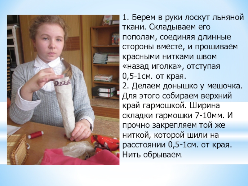 Слайд 131. Берем в руки лоскут льняной ткани. Складываем его пополам, соединяя