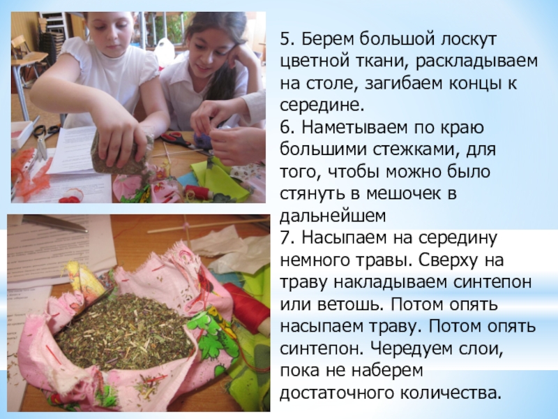 Слайд 22Берем лоскут светлой ткани в середину кладем ветошь.