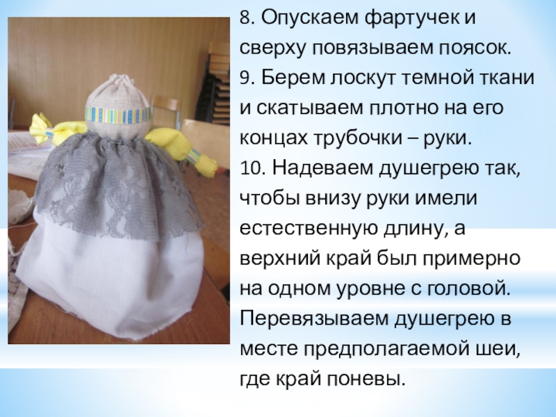 8. Верхнюю часть куклы вкладываем в сарафан и затягиваем края,