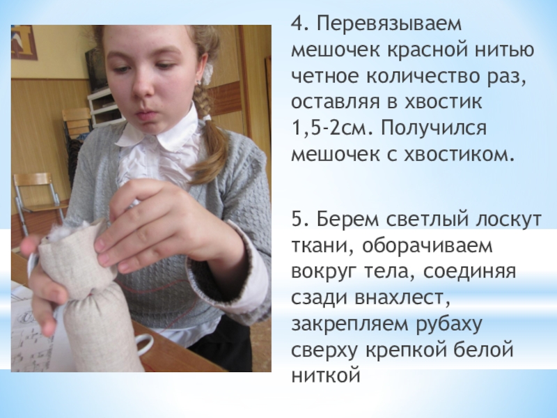 Слайд 154. Перевязываем мешочек красной нитью четное количество раз, оставляя в хвостик