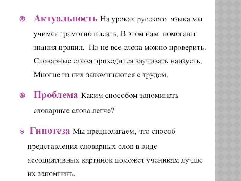 Гипотеза Мы предполагаем, что способ представления словарных слов в виде ассоциативных картинок поможет ученикам лучше их запомнить.
