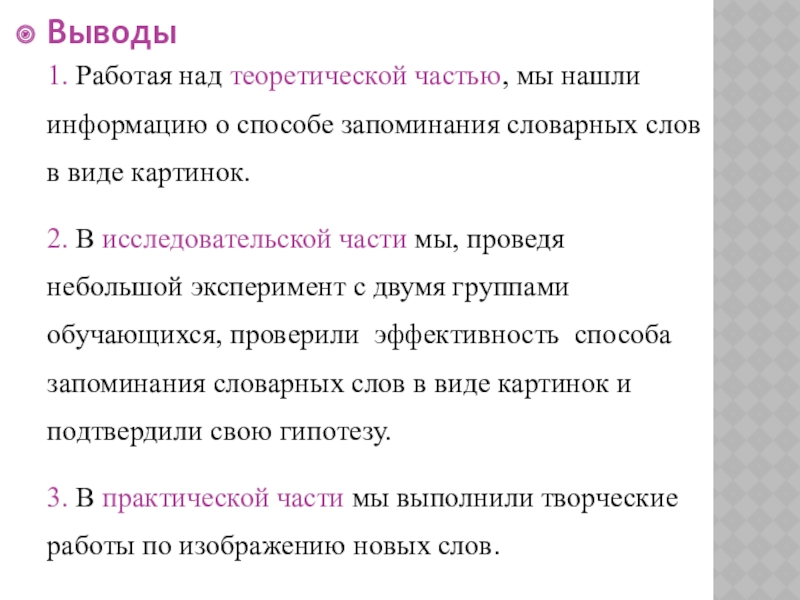 Выводы1. Работая над теоретической частью, мы нашли информацию о способе запоминания словарных слов в виде картинок.2. В