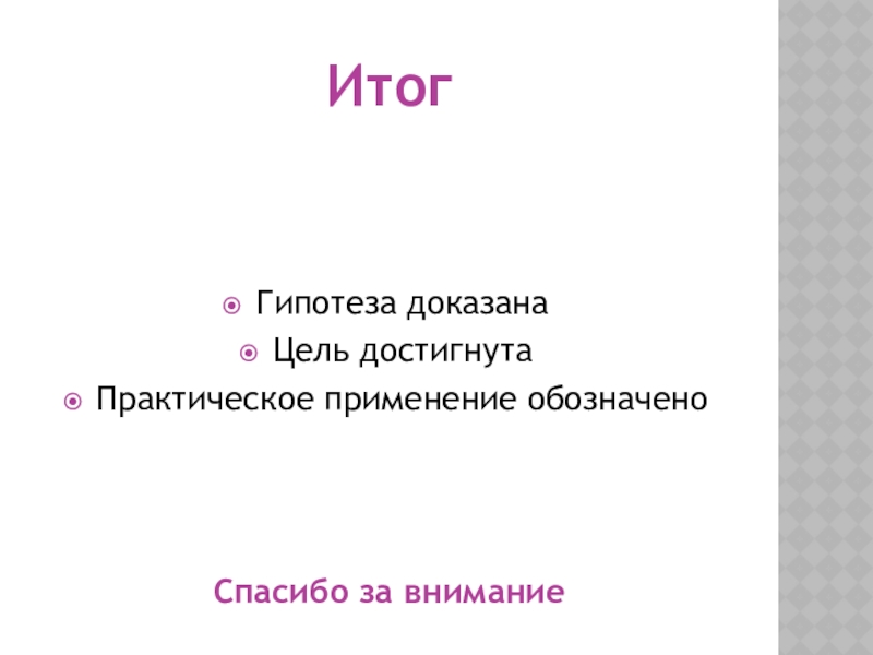 ИтогГипотеза доказанаЦель достигнутаПрактическое применение обозначеноСпасибо за внимание