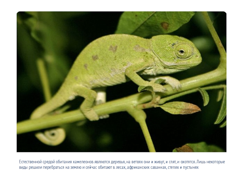 Слайд 8Естественной средой обитания хамелеонов являются деревья, на ветвях они и живут,