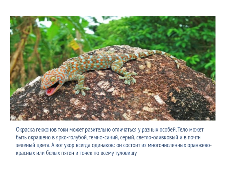Слайд 11Окраска гекконов токи может разительно отличаться у разных особей. Тело может