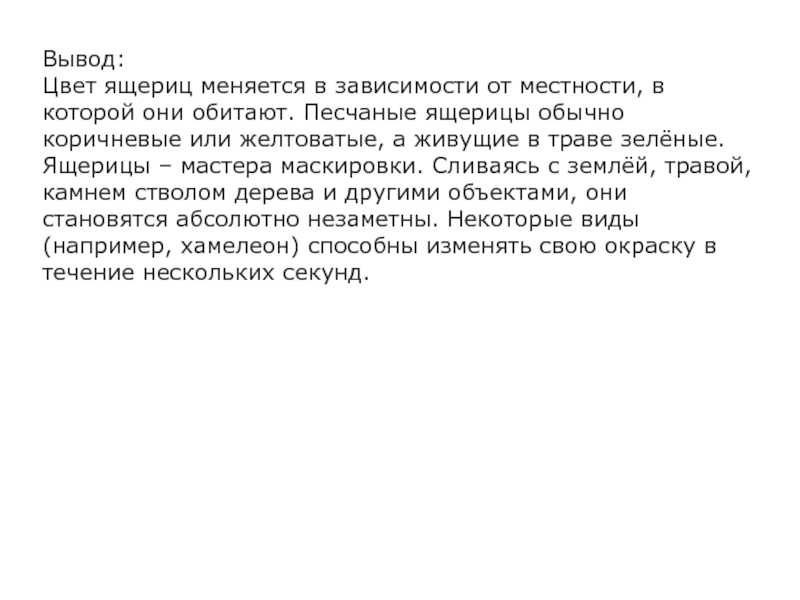 обитают. Песчаные ящерицы обычно коричневые или желтоватые, а живущие в траве зелёные. Ящерицы – мастера маскировки. Сливаясь с землёй, травой, камнем стволом дерева и другими объектами, они становятся абсолютно незаметны. Некоторые виды (например, хамелеон) способны изменять свою окраску в течение нескольких секунд.