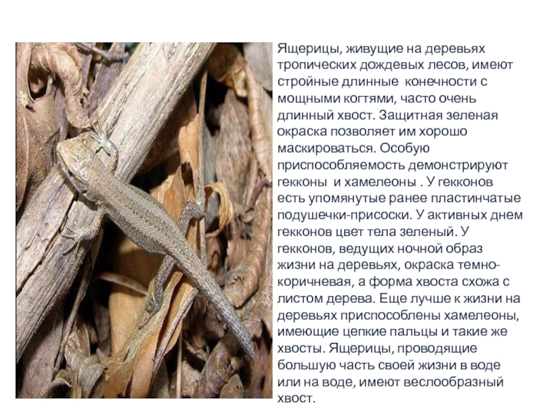 Слайд 6Ящерицы, живущие на деревьях тропических дождевых лесов, имеют стройные длинные конечности
