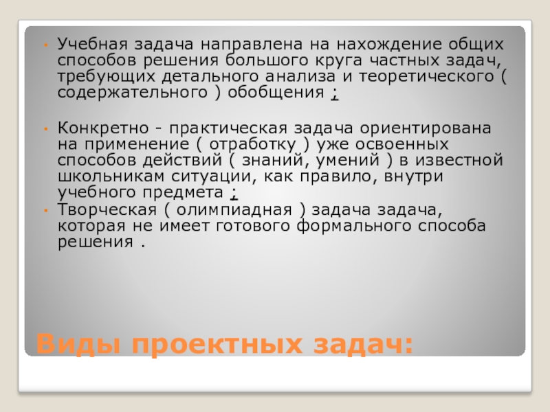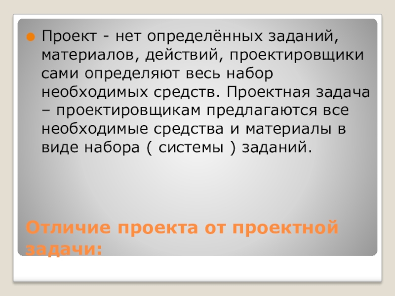 проектировщики сами определяют весь набор необходимых средств. Проектная задача – проектировщикам предлагаются все необходимые средства и материалы в виде набора ( системы ) заданий.