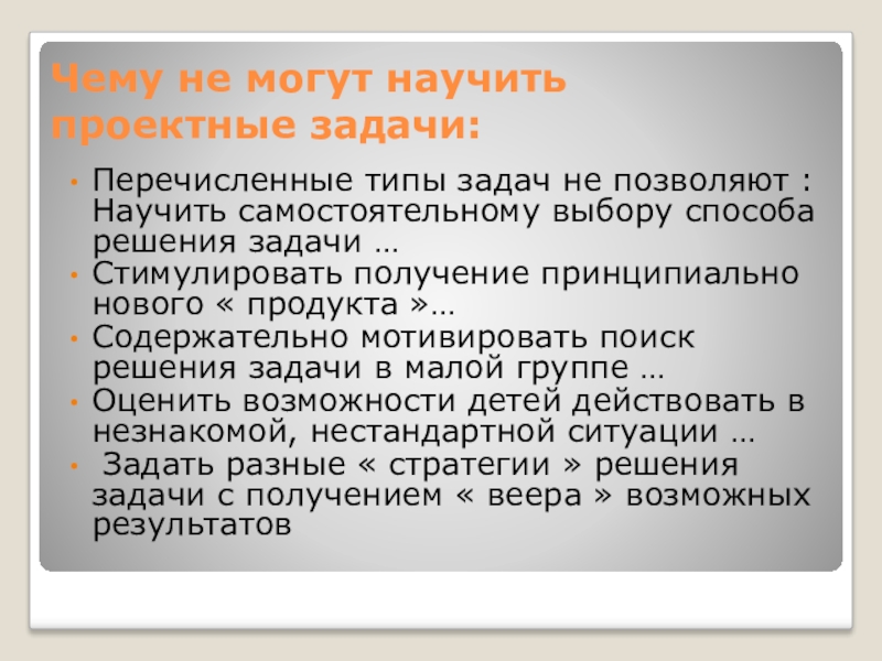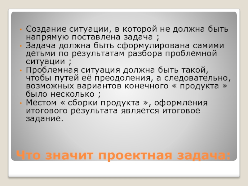 Проблемная ситуация должна быть такой, чтобы путей её преодоления, а следовательно, возможных вариантов конечного « продукта » было несколько ;