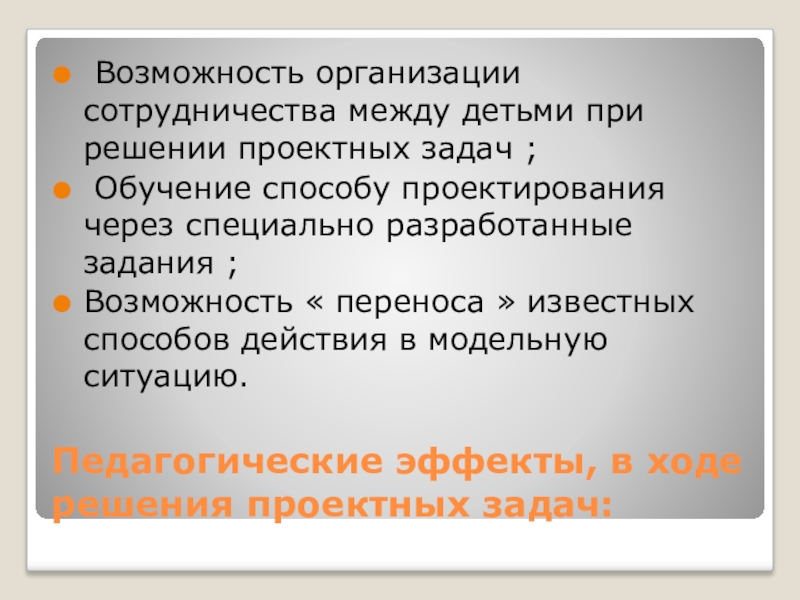 Слайд 12Педагогические эффекты, в ходе решения проектных задач: