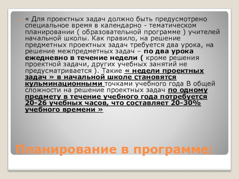 в календарно - тематическом планировании ( образовательной программе ) учителей начальной школы. Как правило, на решение предметных проектных задач требуется два урока, на решение межпредметных задач – по два урока ежедневно в течение недели ( кроме решения проектной задачи, других учебных занятий не предусматривается ). Такие « недели проектных задач » в начальной школе становятся кульминационными точками учебного года В общей сложности на решение проектных задач по одному предмету в течение учебного года потребуется 20-26 учебных часов, что составляет 20-30% учебного времени »
