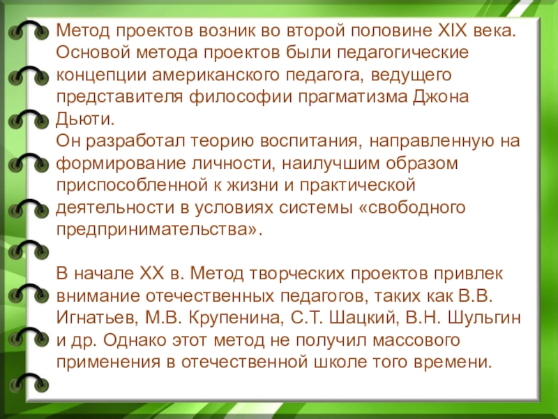 Слайд 5Метод проектов возник во второй половине XIX века. Основой метода проектов