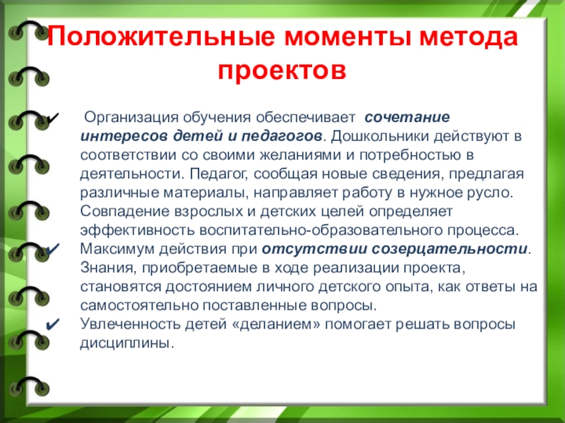 Максимум действия при отсутствии созерцательности. Знания, приобретаемые в ходе реализации проекта, становятся достоянием личного детского опыта, как ответы на самостоятельно поставленные вопросы.
