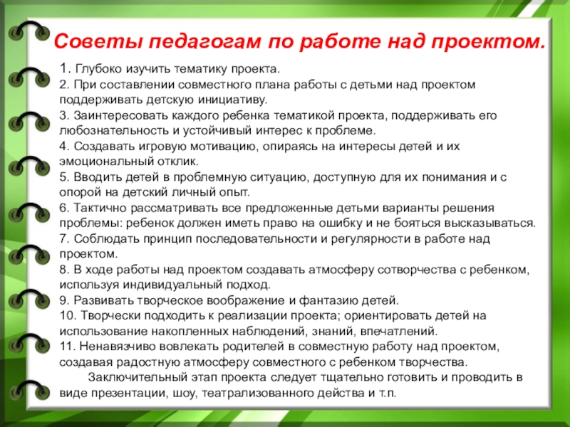 10. Творчески подходить к реализации проекта; ориентировать детей на использование накопленных наблюдений, знаний, впечатлений.