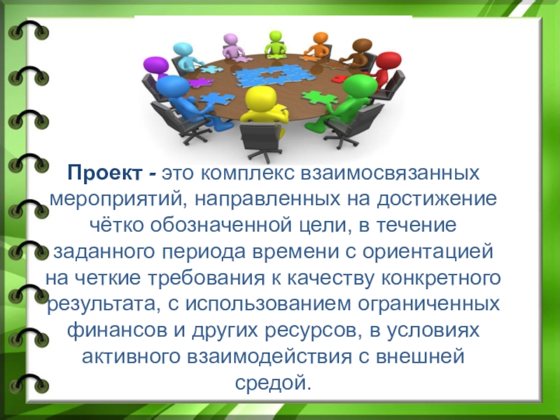 цели, в течение заданного периода времени с ориентацией на четкие требования к качеству конкретного результата, с использованием ограниченных финансов и других ресурсов, в условиях активного взаимодействия с внешней средой.