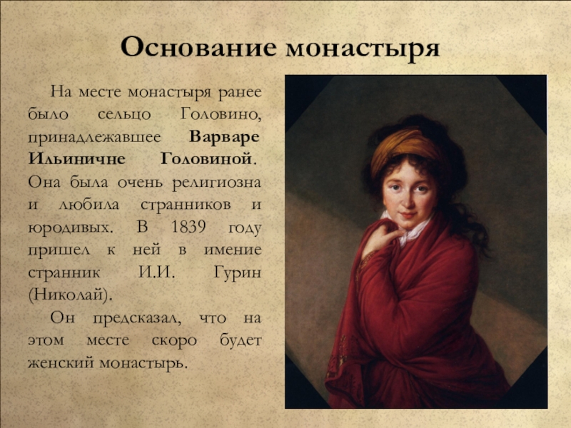 На месте монастыря ранее было сельцо Головино, принадлежавшее Варваре Ильиничне