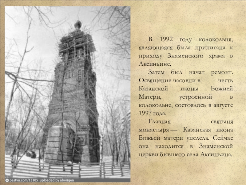 Слайд 26В 1992 году колокольня, являющаяся была приписана к приходу Знаменского храма
