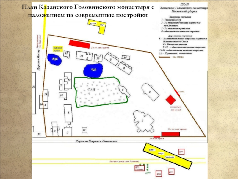 Слайд 13План Казанского Головинского монастыря с наложением на современные постройки