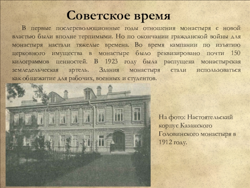 вполне терпимыми. Но по окончании гражданской войны для монастыря настали тяжелые времена. Во время кампании по изъятию церковного имущества в монастыре было реквизировано почти 150 килограммов ценностей. В 1923 году была распущена монастырская земледельческая артель. Здания монастыря стали использоваться как общежитие для рабочих, военных и студентов.