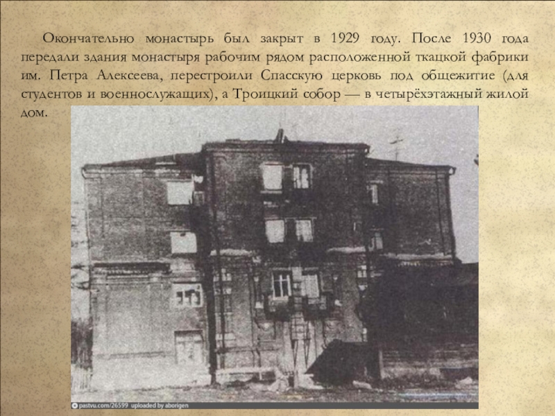 здания монастыря рабочим рядом расположенной ткацкой фабрики им. Петра Алексеева, перестроили Спасскую церковь под общежитие (для студентов и военнослужащих), а Троицкий собор — в четырёхэтажный жилой дом.