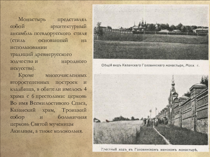 Слайд 14Монастырь представлял собой архитектурный ансамбль псевдорусского стиля (стиль основанный на использовании традиций древнерусского