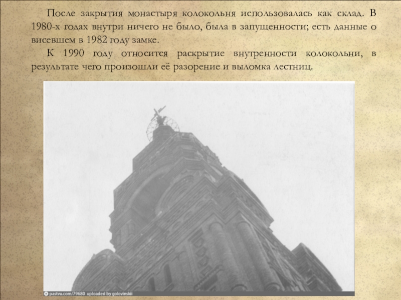 Слайд 25После закрытия монастыря колокольня использовалась как склад. В 1980-х годах внутри