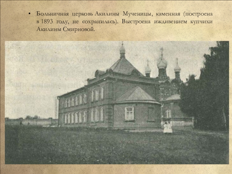 Слайд 17Больничная церковь Акилины Мученицы, каменная (построена в 1893 году, не сохранилась). Выстроена иждивением