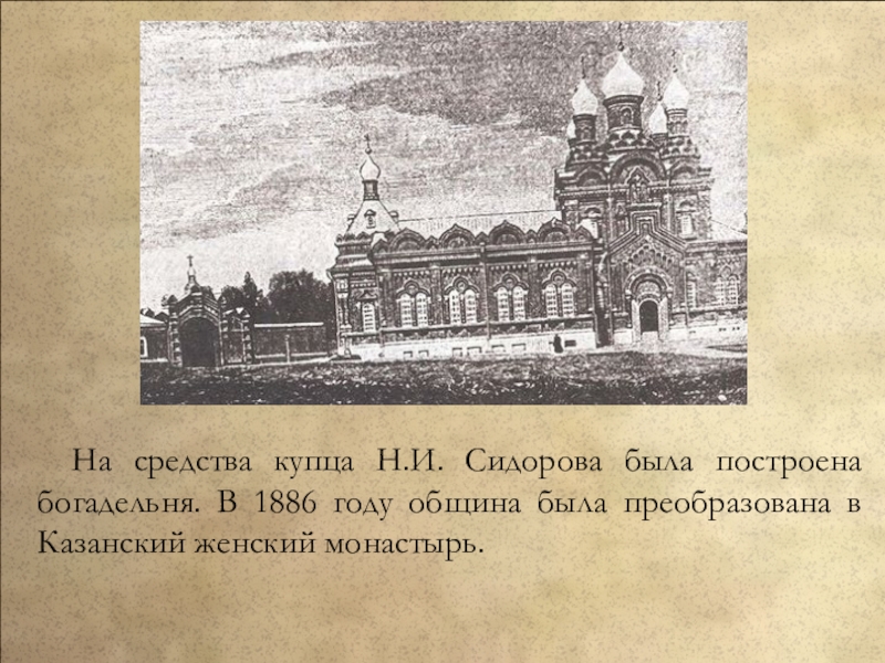 Слайд 12На средства купца Н.И. Сидорова была построена богадельня. В 1886 году