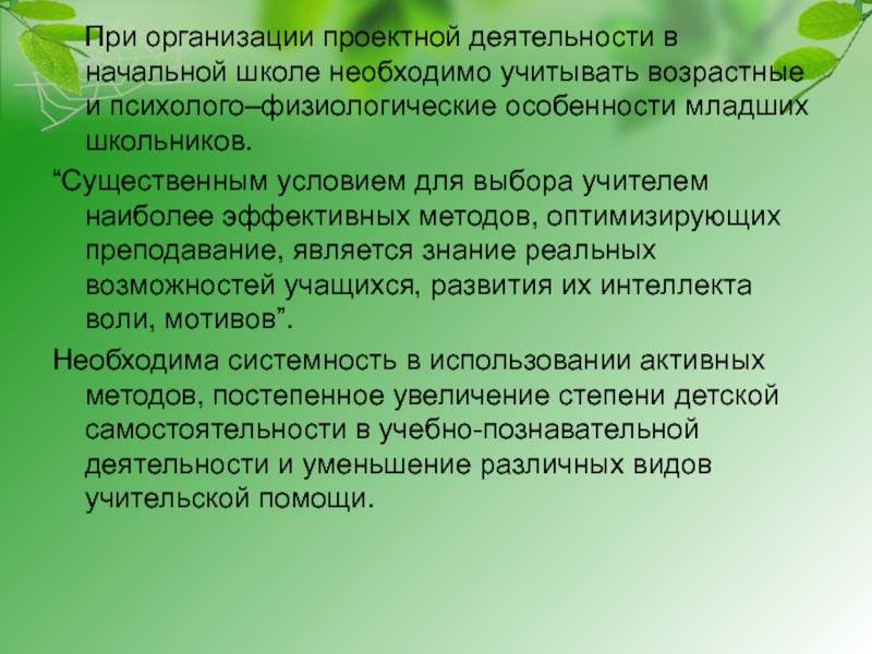 При организации проектной деятельности в начальной школе необходимо учитывать