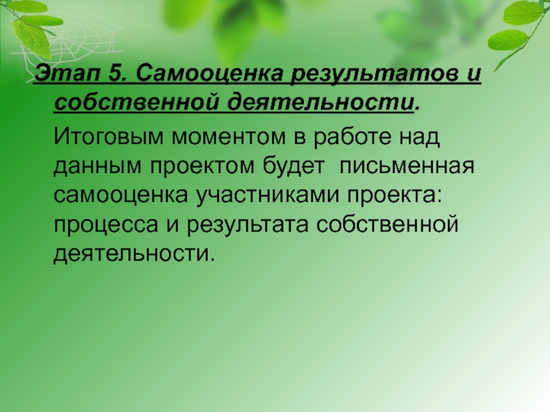 работе над данным проектом будет письменная самооценка участниками проекта: процесса и результата собственной деятельности.