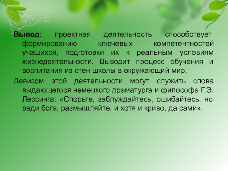 Вывод: проектная деятельность способствует формированию ключевых компетентностей учащихся, подготовки их к