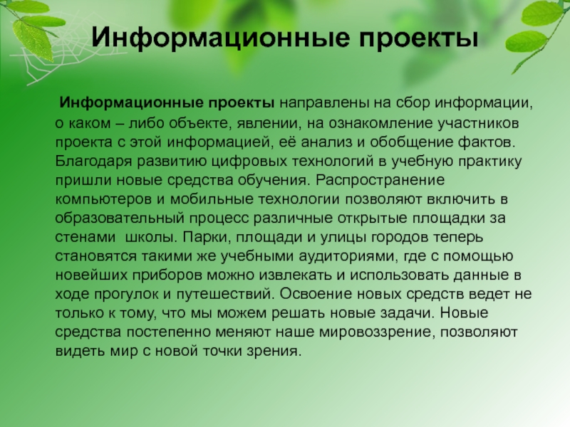 либо объекте, явлении, на ознакомление участников проекта с этой информацией, её анализ и обобщение фактов. Благодаря развитию цифровых технологий в учебную практику пришли новые средства обучения. Распространение компьютеров и мобильные технологии позволяют включить в образовательный процесс различные открытые площадки за стенами школы. Парки, площади и улицы городов теперь становятся такими же учебными аудиториями, где с помощью новейших приборов можно извлекать и использовать данные в ходе прогулок и путешествий. Освоение новых средств ведет не только к тому, что мы можем решать новые задачи. Новые средства постепенно меняют наше мировоззрение, позволяют видеть мир с новой точки зрения.