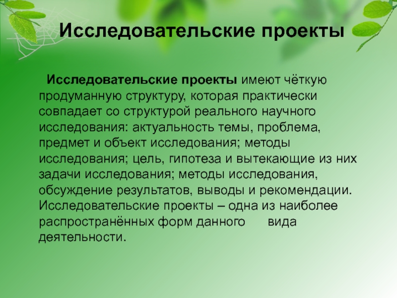 практически совпадает со структурой реального научного исследования: актуальность темы, проблема, предмет и объект исследования; методы исследования; цель, гипотеза и вытекающие из них задачи исследования; методы исследования, обсуждение результатов, выводы и рекомендации. Исследовательские проекты – одна из наиболее распространённых форм данного вида деятельности.