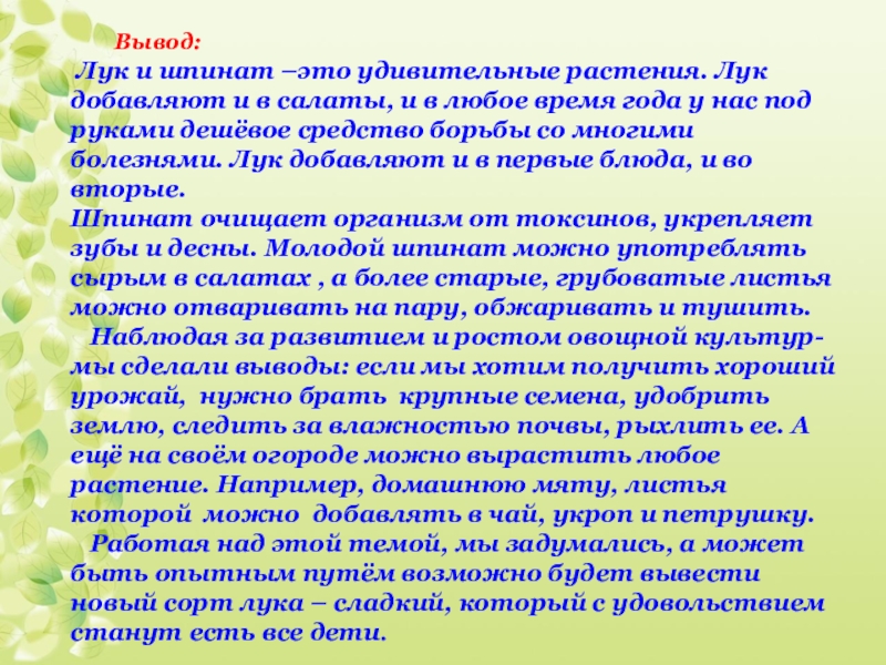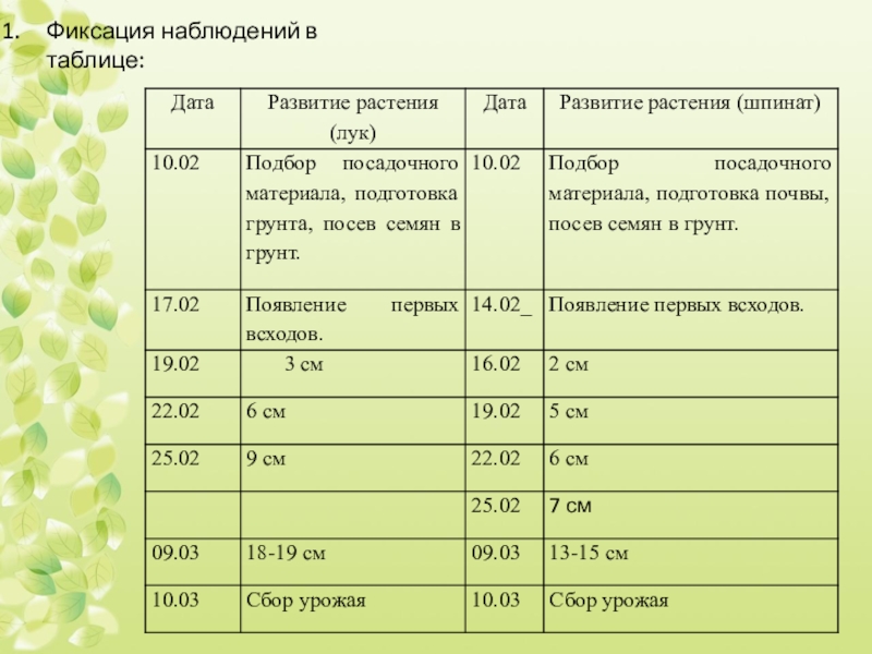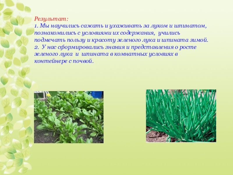 1. Мы научились сажать и ухаживать за луком и шпинатом,