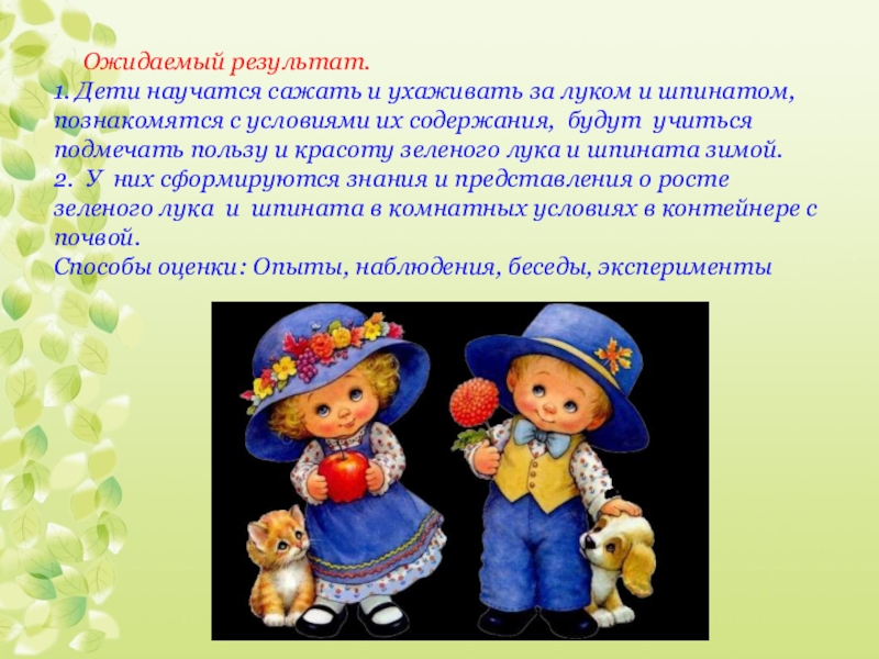 2. У них сформируются знания и представления о росте зеленого лука и шпината в комнатных условиях в контейнере с почвой.