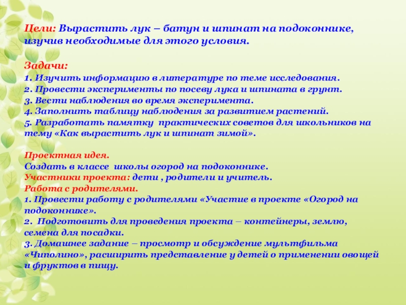 Слайд 3Цели: Вырастить лук – батун и шпинат на подоконнике, изучив необходимые