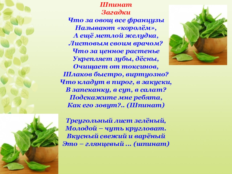 Шпинат очищает организм от токсинов, укрепляет зубы и десны. Молодой шпинат можно употреблять сырым в салатах , а более старые, грубоватые листья можно отваривать на пару, обжаривать и тушить.