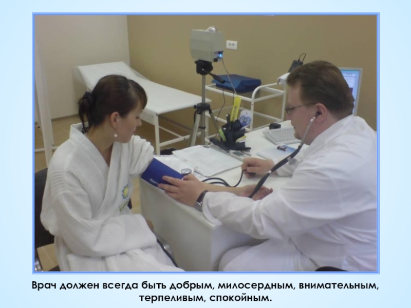 Слайд 7Врач должен всегда быть добрым, милосердным, внимательным, терпеливым, спокойным.