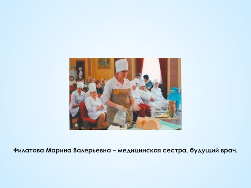 Слайд 19Филатова Марина Валерьевна – медицинская сестра, будущий врач.