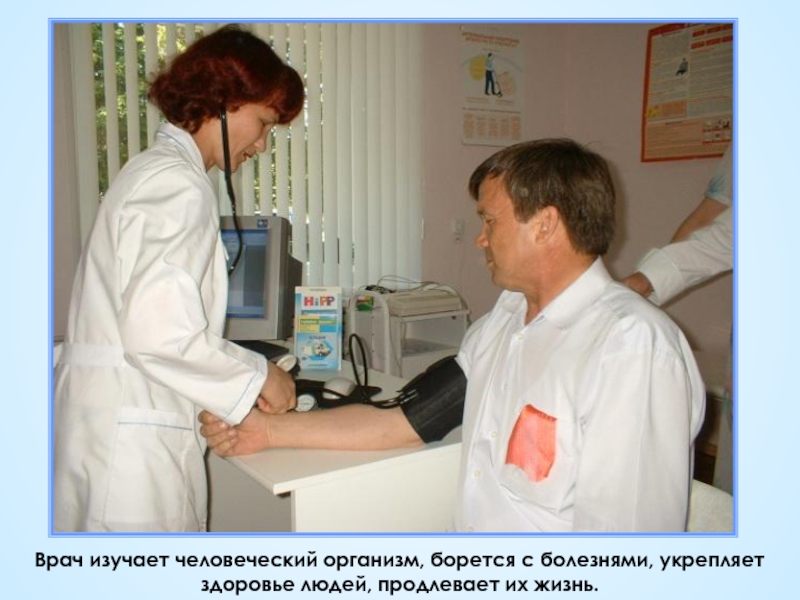 Слайд 4Врач изучает человеческий организм, борется с болезнями, укрепляет здоровье людей, продлевает