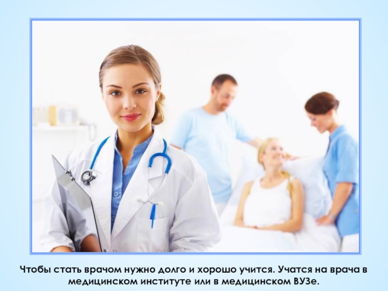 Слайд 6Чтобы стать врачом нужно долго и хорошо учится. Учатся на врача
