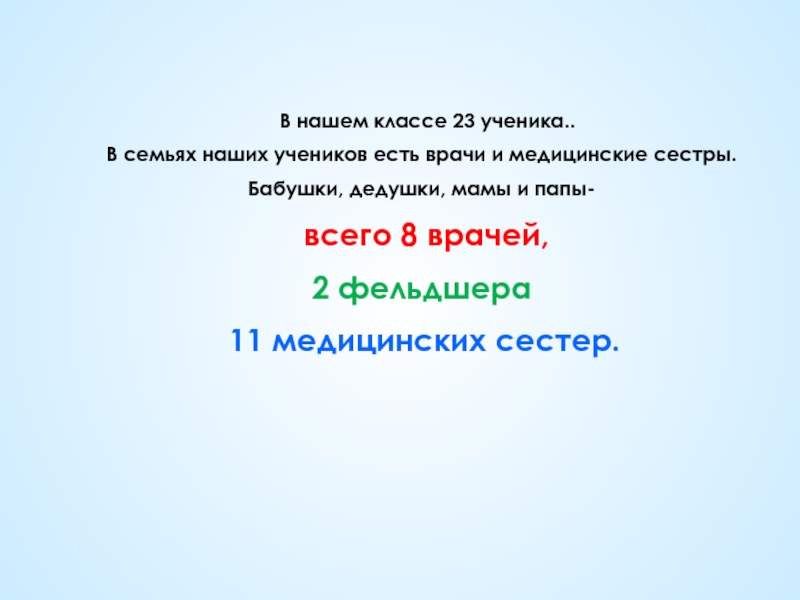 В нашем классе 23 ученика..В семьях наших учеников есть врачи и медицинские сестры.Бабушки, дедушки, мамы и