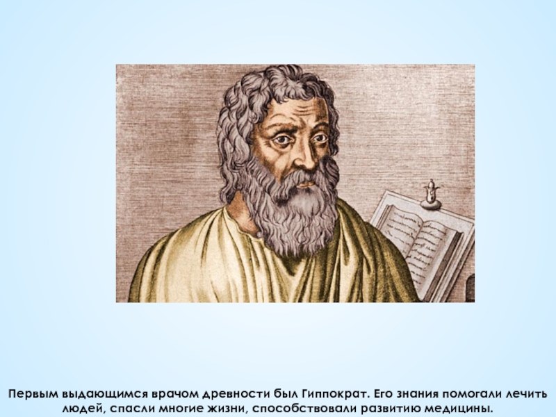 Слайд 2Первым выдающимся врачом древности был Гиппократ. Его знания помогали лечить людей,