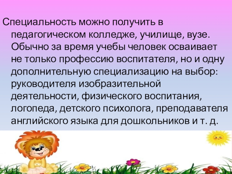 за время учебы человек осваивает не только профессию воспитателя, но и одну дополнительную специализацию на выбор: руководителя изобразительной деятельности, физического воспитания, логопеда, детского психолога, преподавателя английского языка для дошкольников и т. д.
